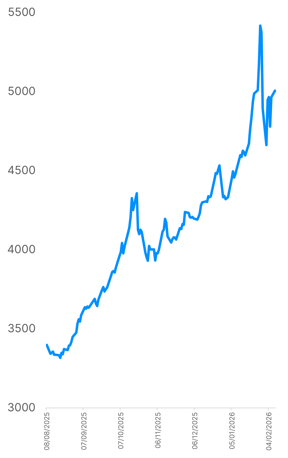 A számokat tekintve az arany teljesítménye az elmúlt évben megdöbbentő: 2025 elején 2856 dollár/uncia volt, február elején pedig 4894 dollár/uncia volt a záróár. Alapvetőenkörülbelül 71,36%-os éves hozamról beszélünk, az alacsony (2857 dollár) és a magas (5417 dollár) árfolyam közötti éves ingadozás pedig közel 90% volt.